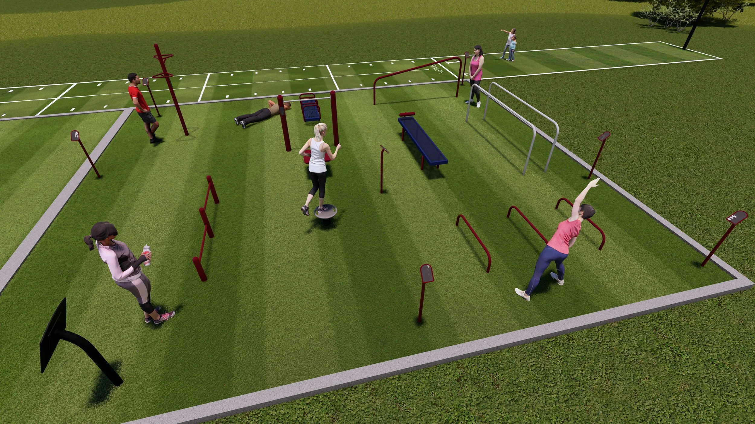 This zone features a balance board, vault bar, sit-up station, push-up station, parallel bar, knee lift station, hurdle station, bench, and horizontal chin up.